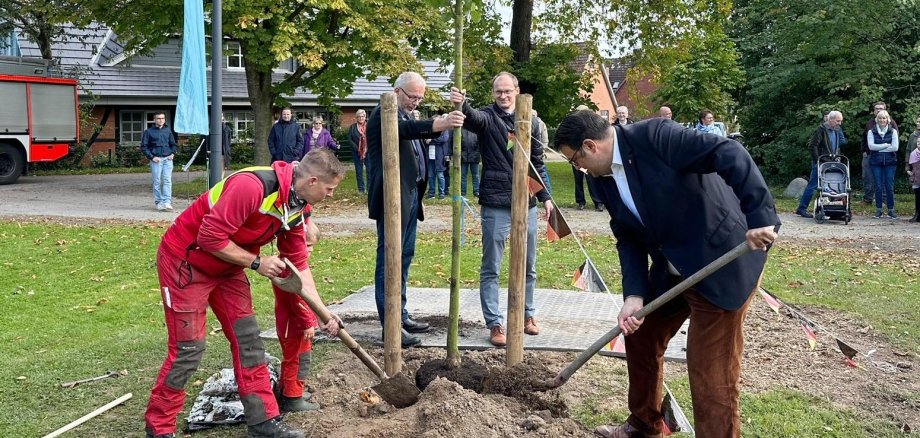 vlnr Sönke Petersen, Gemeindevertretung Duvensee, Bürgermeister Hans-Peter Grell, Bundestagskandidat Henri Schmidt und MdL Rasmus Vöge pflanzen gemeinsam die Linde am Dorfplatz